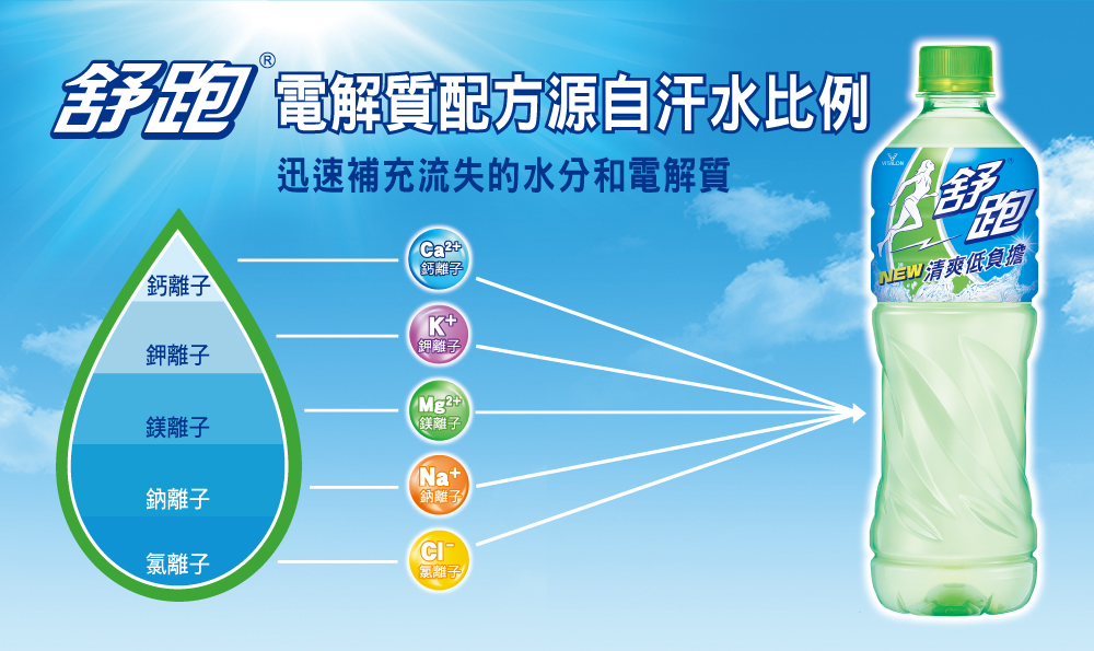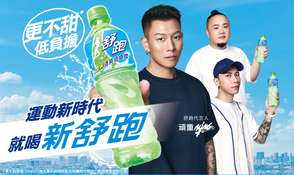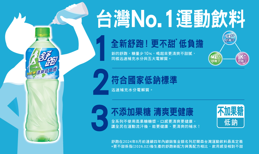 因應消費者生活與運動習慣改變,對「清爽低負擔」飲用需求的提升,品牌推出新舒跑,全面進化,糖量少10%,清爽更不甜*,讓補充水分電解質變得更健康。